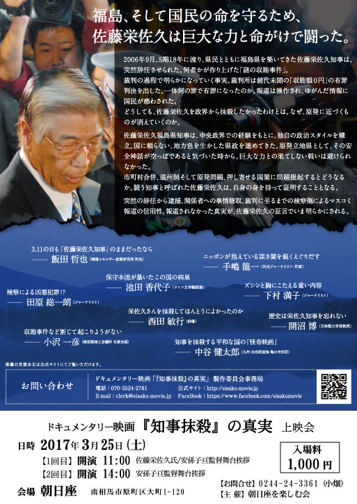 http://asahiza.blog.shinobi.jp/Entry/78/3/25 ドキュメンタリー映画「『知事抹殺』の真実」