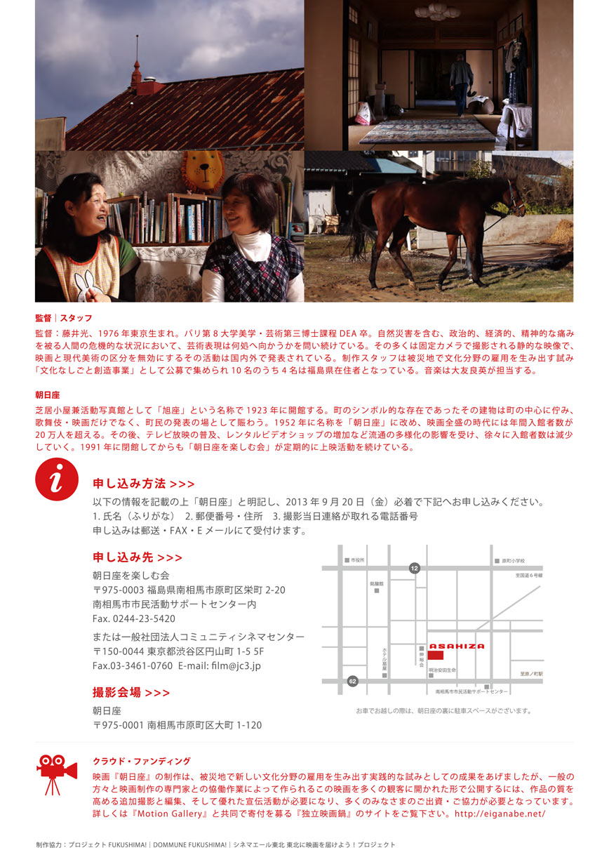 映画『朝日座』の制作は、被災地で新しい文化分野の雇用を生み出す実践的な試みとしての成果をあげましたが、一般の方々と映画製作の専門家との共同作業によって作られるこの映画を多くの観客に開かれた形で公開するには、作品の質を高める追加撮影と編集、そしてすぐれた宣伝活動が必要になり、多くのみなさまのご出資・ご協力が必要となっています。詳しくは『