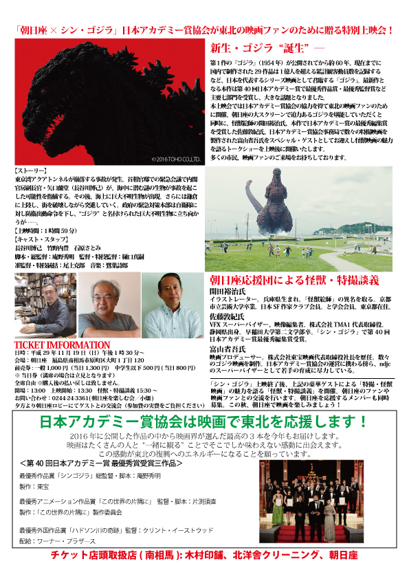 http://asahiza.blog.shinobi.jp/Entry/83/11/19 『シン・ゴジラ』上映と豪華ゲストによる「怪獣・特撮談義」